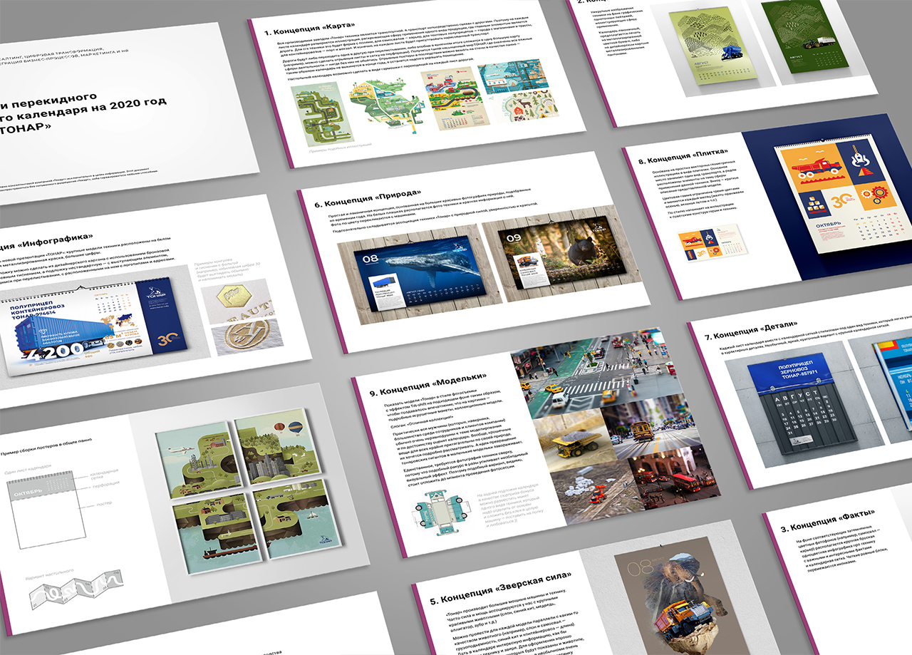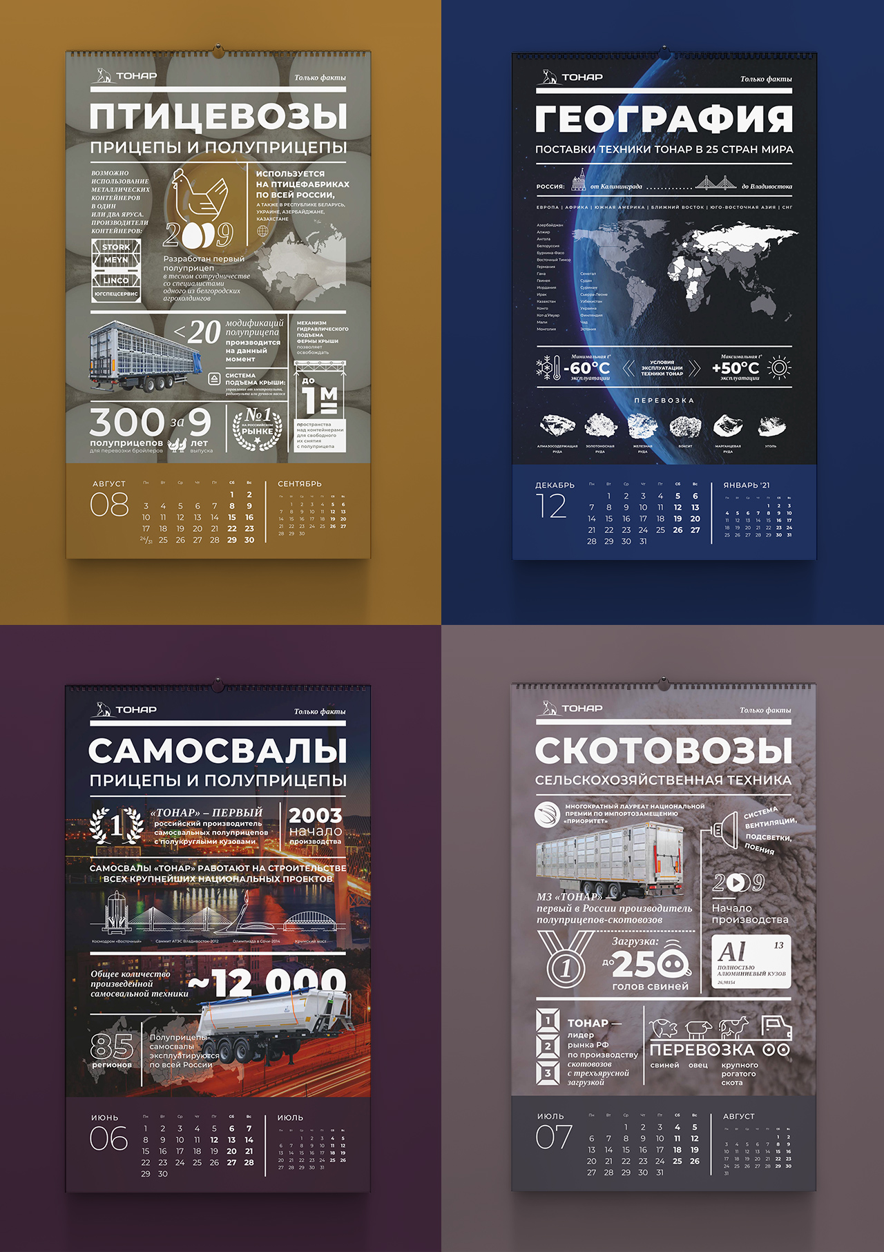 МЗ «Тонар» — крупнейший российский производитель прицепной и полуприцепной техники, карьерных самосвалов и автопоездов повышенной грузоподъемности. Вдохновленные таким масштабом, наши дизайнеры предложили несколько разных концепций календарей: от лаконичных технических до неожиданно творческих.