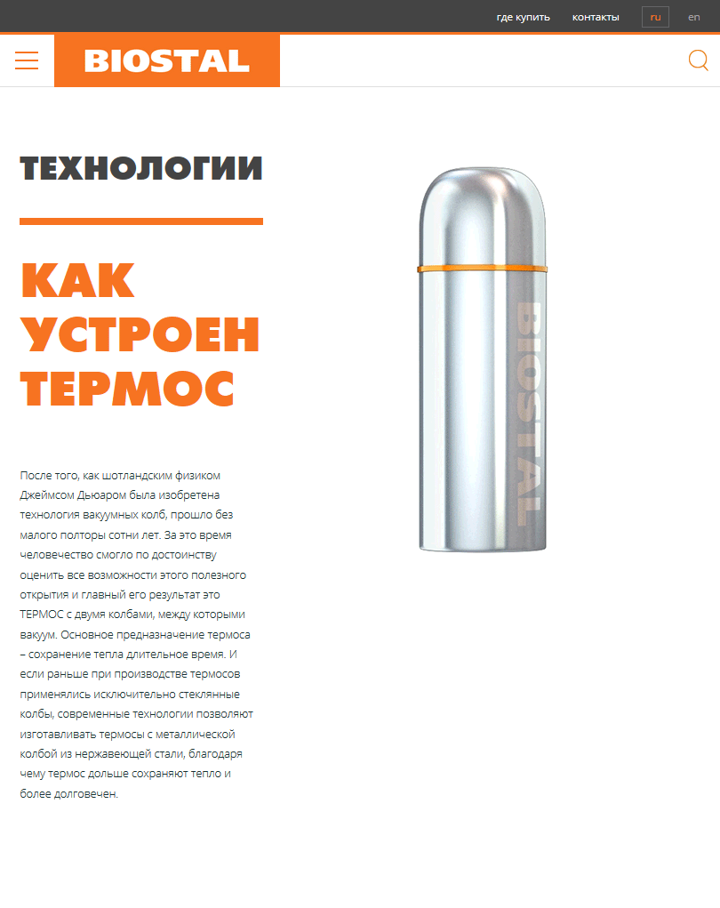 Специально для раздела «Технологии» была сделана трехмерная модель термоса и создана анимация. Конечный результат — интерактивная модель термоса, которая позволяет во всех подробностях узнать его устройство и технологические особенности.