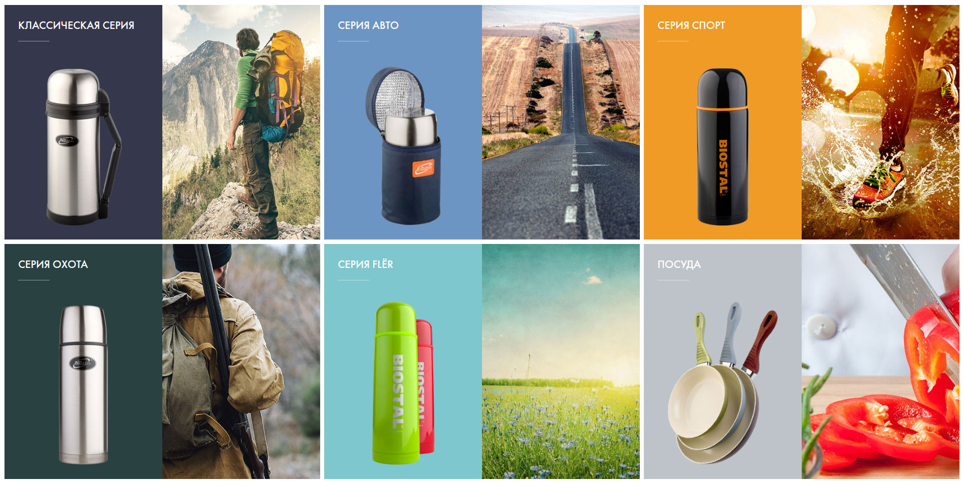 Оформление раздела «Серии». Компания Biostal выпускает термосы из нержавеющей стали шести серий: «Классика», «Авто», «Охота», «Спорт», «Flёr».
