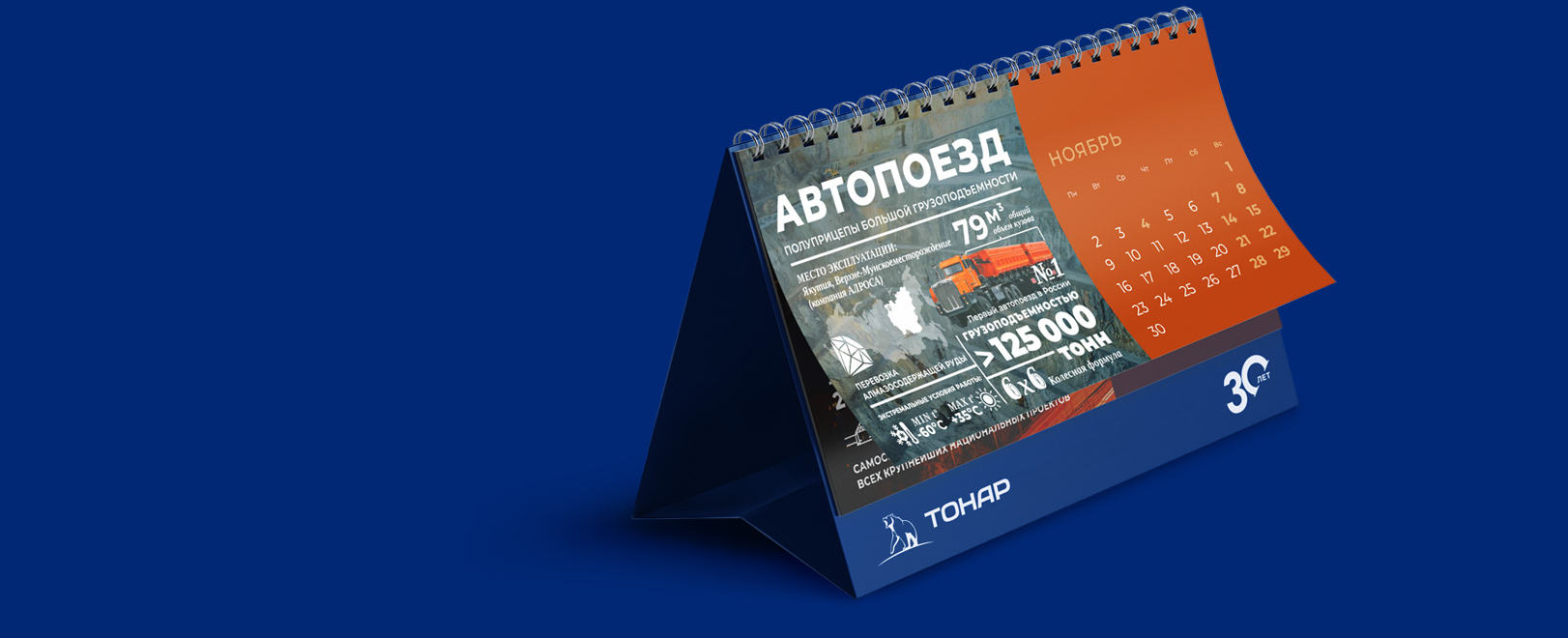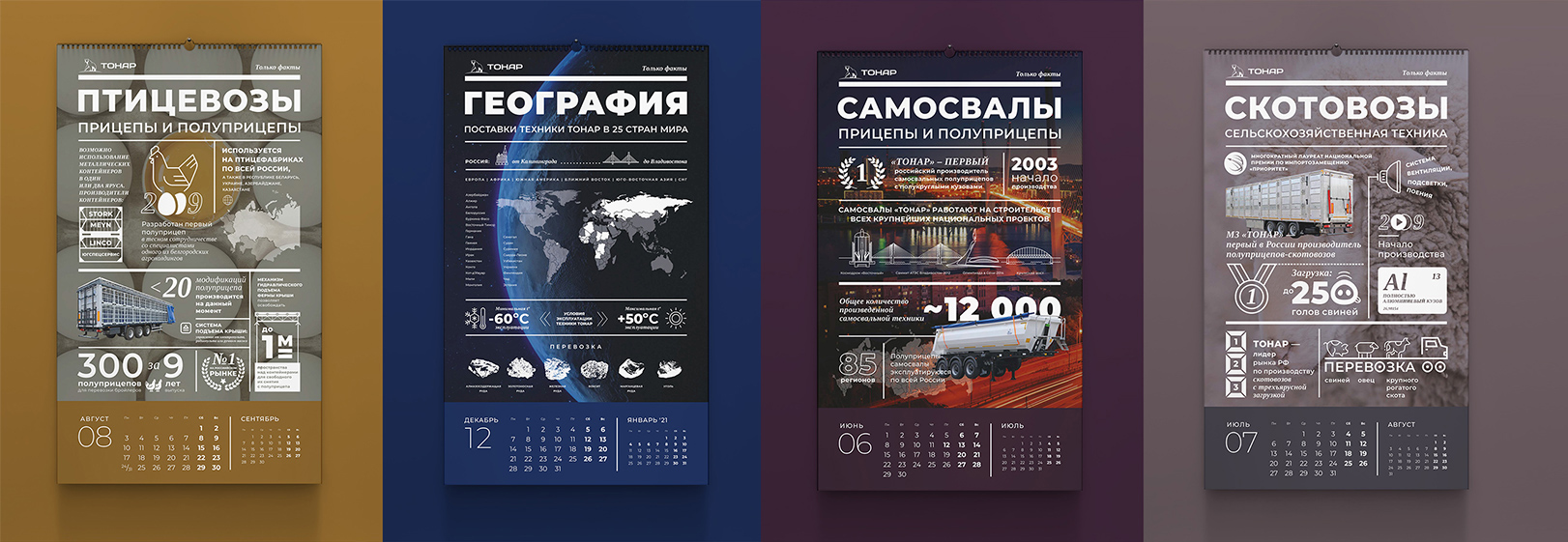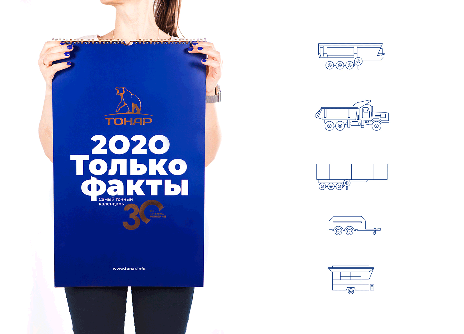 В преддверии Нового года нарисован большой настенный календарь с инфографикой, раскрывающий интересные факты о заводе, его истории, географии продаж и, конечно, о каждом из типов выпускаемой техники. Для иллюстраций создан ряд векторных изображений завода и объектов, при строительстве которых использовалась техника МЗ «ТОНАР».
